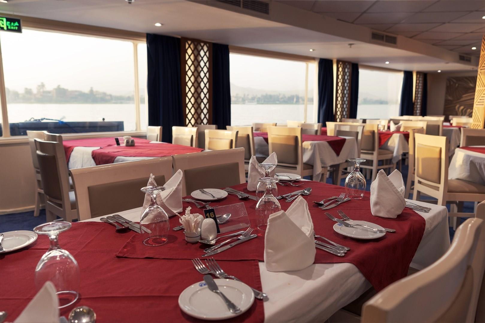 The restaurant and bar on the Nile Crown I offer a delightful array of gourmet cuisine and refreshing cocktails, all set against stunning views of the Nile.